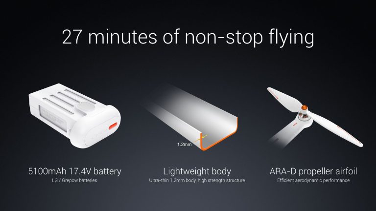 The Mi Drone has a 4-propeller system with detachable shields, just like most of the drones in the market. It is equipped with a 1090p or 4K UHD camera, with 104° wide-angle lens. It can also provide a 720p with low latency from up to 2 km distance. The camera is attached to a 3-axis gimbal that stabilizes up to 2000 vibrations per second. The drone is very lightweight with a modular design and landing gear.